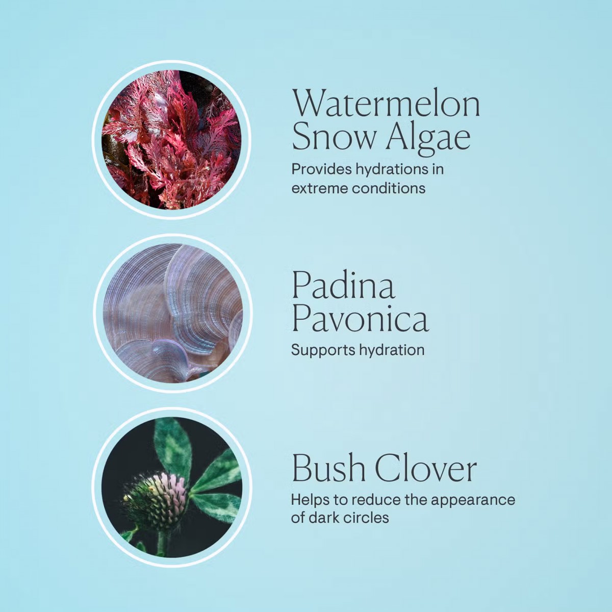 Το υαλουρονικό οξύ που περιέχει συνδυάζεται με τα πλούσια σε αμινοξέα φύκια Watermelon Snow, Bush Clover και τα φύκια Padina Pavonica, που ενισχύουν την υγρασία, για να λειαίνουν τις λεπτές γραμμές και τις ρυτίδες.