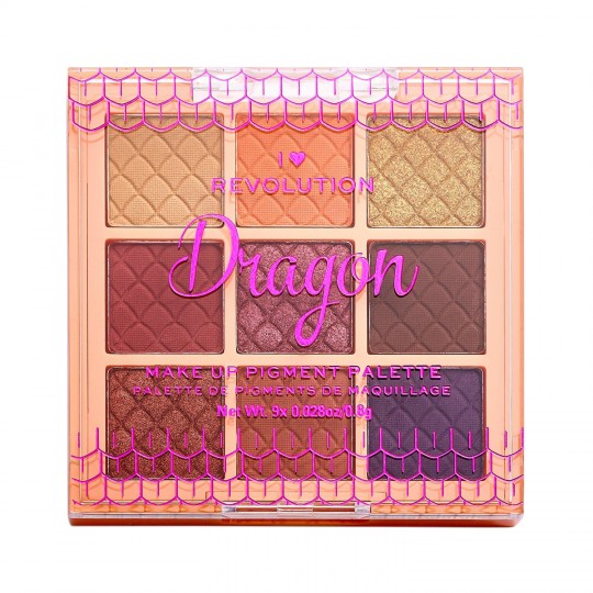 Η I Heart Revolution Fantasy Makeup Pigment παλέτα - Dragon αποτελείται από 9 σκιές υψηλής χρωματικής απόδοσης, ματ αλλά και shimmer και σε αποχρώσεις του χρυσού, του μουσταρδί, του κεραμιδί και του μωβ.