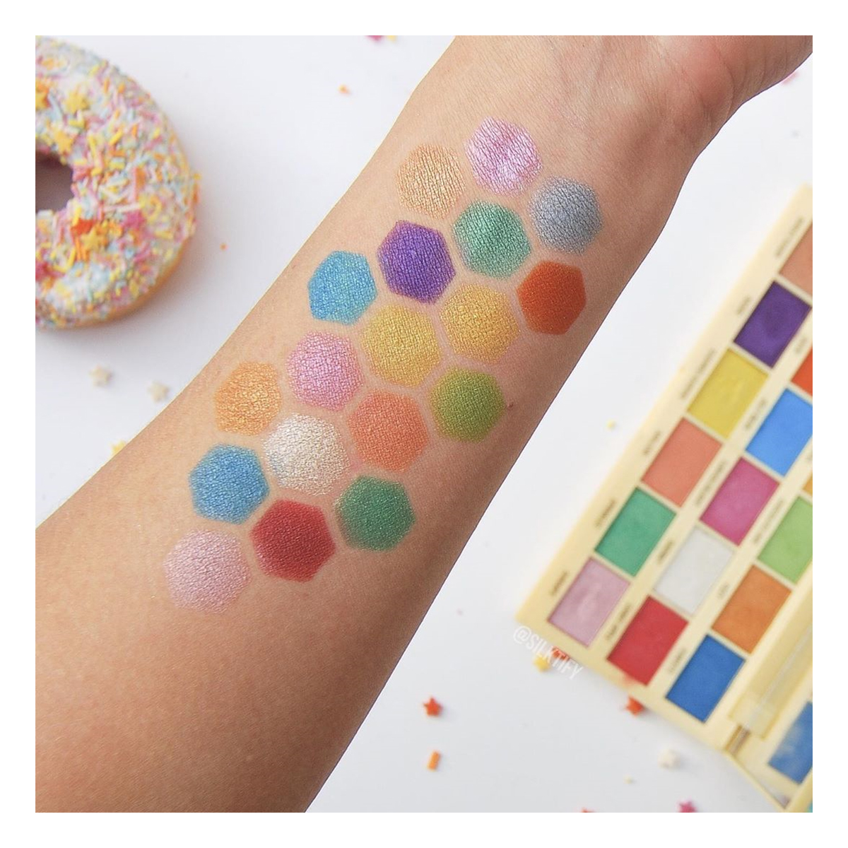 I Heart Revolution Sprinkles Chocolate Eyeshadow παλέτα περιέχει 18 φωτεινές πολύχρωμες μεταλλικές σκιές σε αποχρώσεις του κόκκινου, του μωβ, του χρυσού, του μπλε, του κίτρινου, του κεραμιδί και του πράσινου.