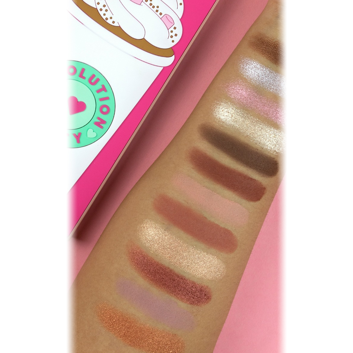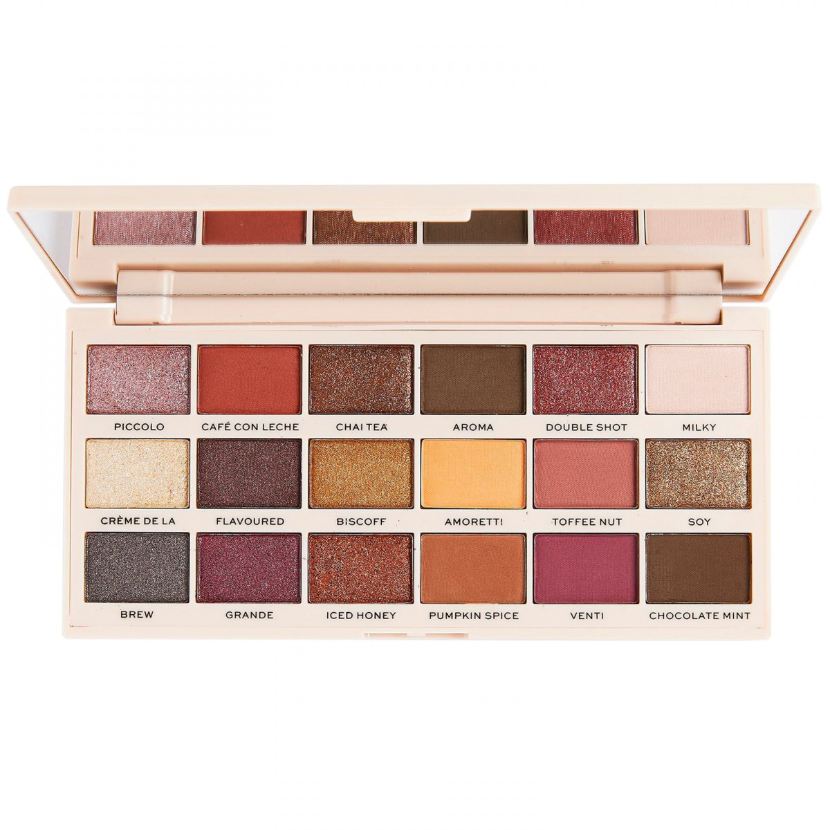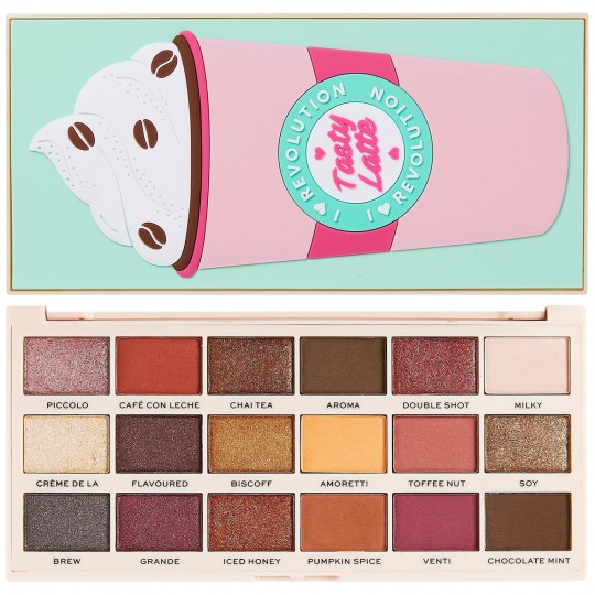 H I Heart Revolution Tasty Eyeshadow Palette Latte αποτελείται από 18 ματ και shimmer σκιές σε ζεστές, γήινες αποχρώσεις του σοκολατί, του καρυδί (πεκάν), της καραμέλας, του μωβ και του χρυσού για να δημιουργήσετε πολλές και διαφορετικές εμφανίσεις.