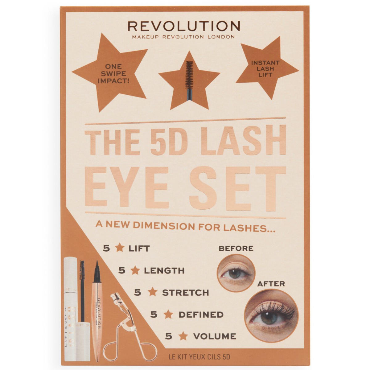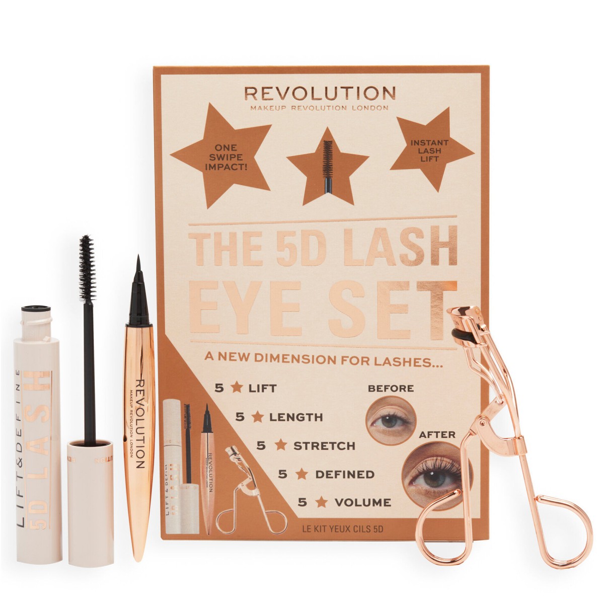 Αναδείξτε τα μάτια σας με το Revolution 5D Lash Eye σετ, που διαθέτει τη διάσημη μάσκαρα 5D Lash, το Renaissance Flick Liner και το νέο Rose Gold Eyelash Culers.