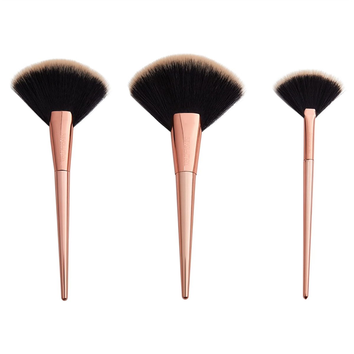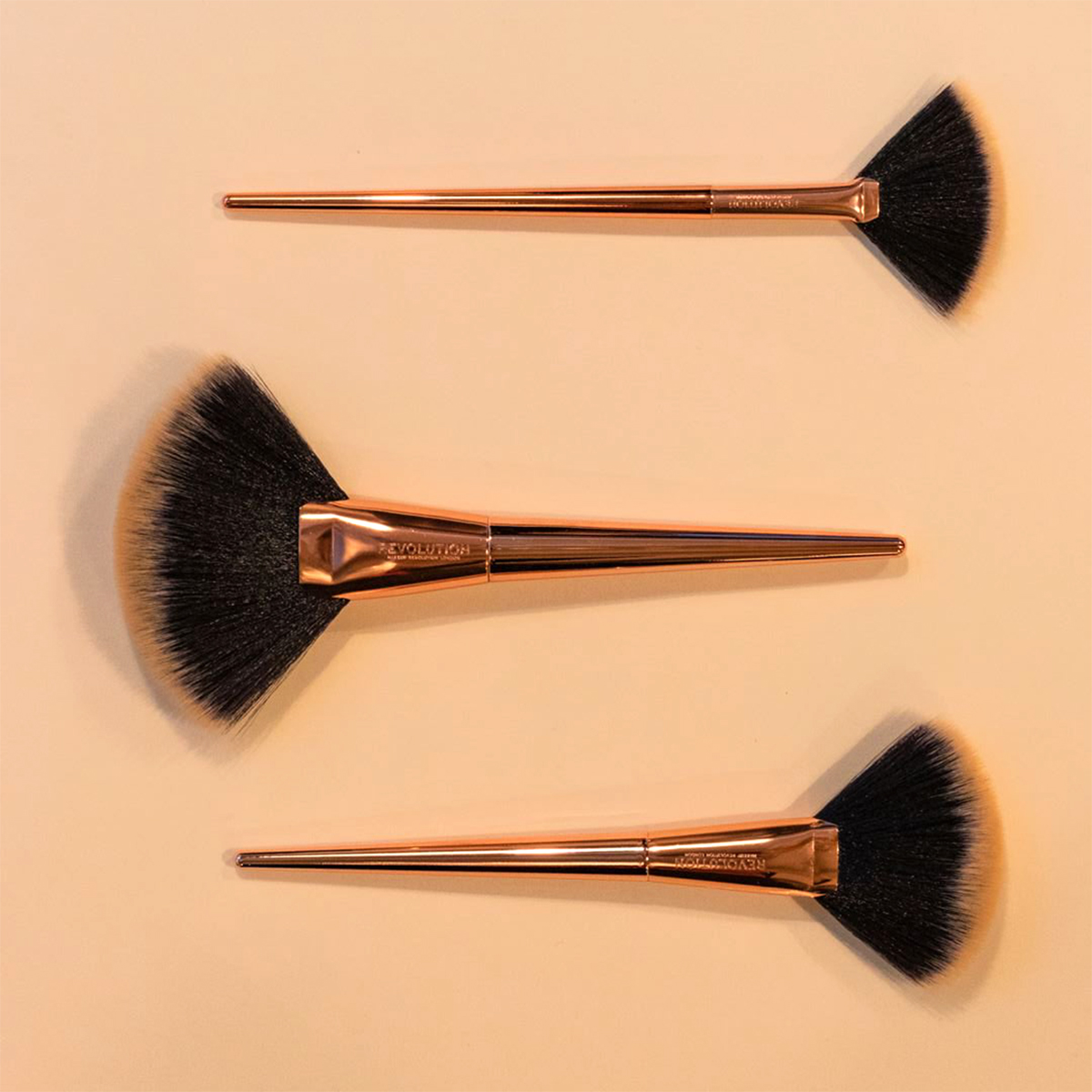 Εάν επιθυμείτε να ορίσετε και να φωτίσετε το πρόσωπό σας ή να δώσετε στο σώμα σας λάμψη, το σετ πινέλων-βεντάλια της Revolution περιλαμβάνει 3 διαφορετικά σε μέγεθος πινέλα με όμορφες χρυσές χειρολαβές σε ροζ χρυσό και ευέλικτες, εξαιρετικά μαλακές τρίχες στην κεφαλή τους για μία άψογη εφαρμογή των προϊόντων λάμψης.