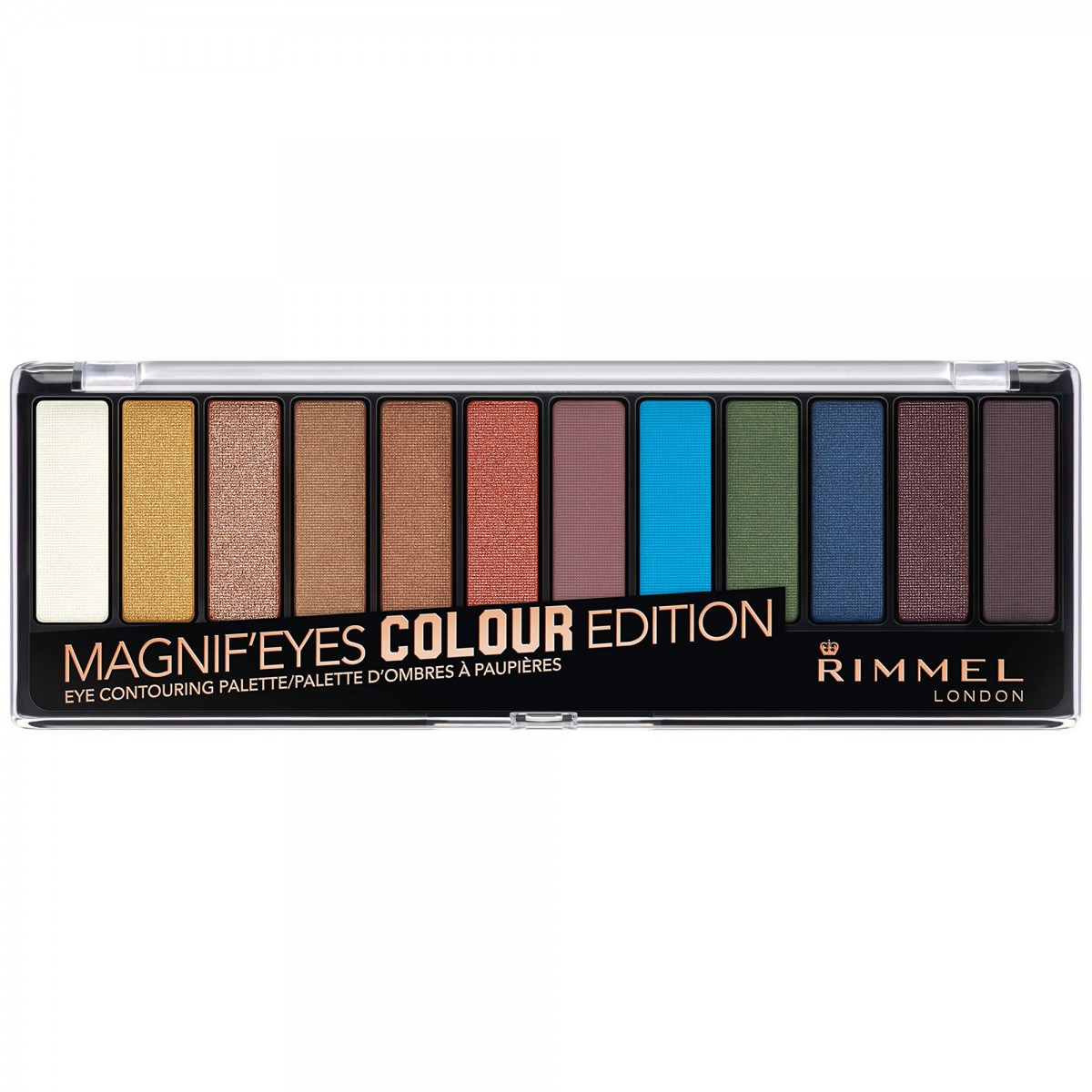 Η Rimmel Magnif'Eyes Eyeshadow παλέτα περιέχει 12 σκιές υψηλής χωματικής απόδοσης, με βελούδινη σύσταση για εύκολη ανάμειξη κι ένα μακράς διάρκειας αποτέλεσμα.