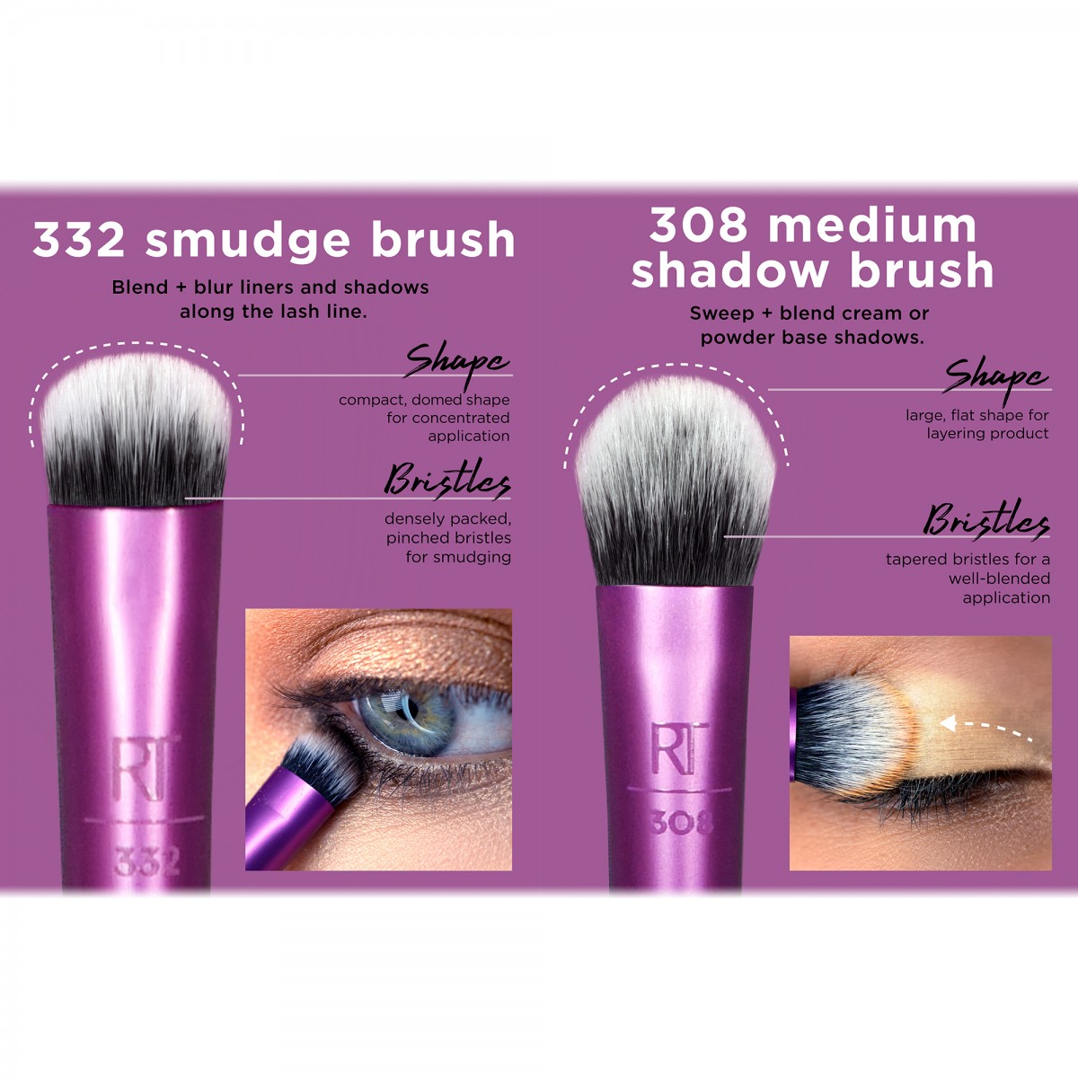 - Τρίχες: Κοντές, πυκνές τρίχες για την ακριβή εφαρμογή των προϊόντων. - RT 332 Smudge Brush, Απλώστε και μπλεντάρετε τη σκιά κατά μήκος της γραμμής των βλεφαρίδων.