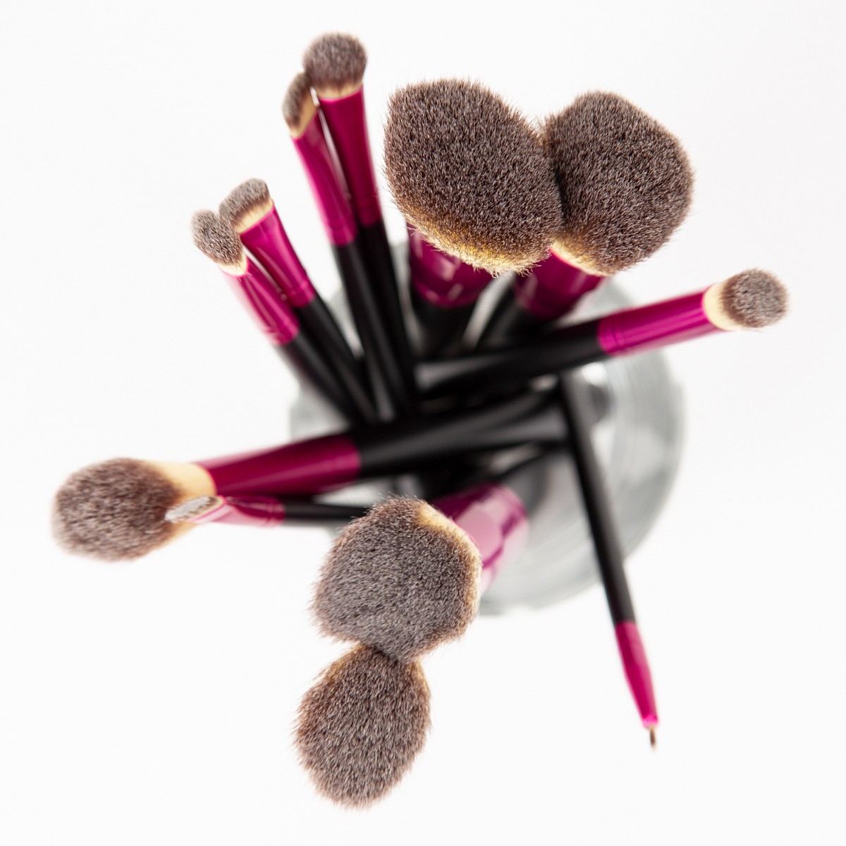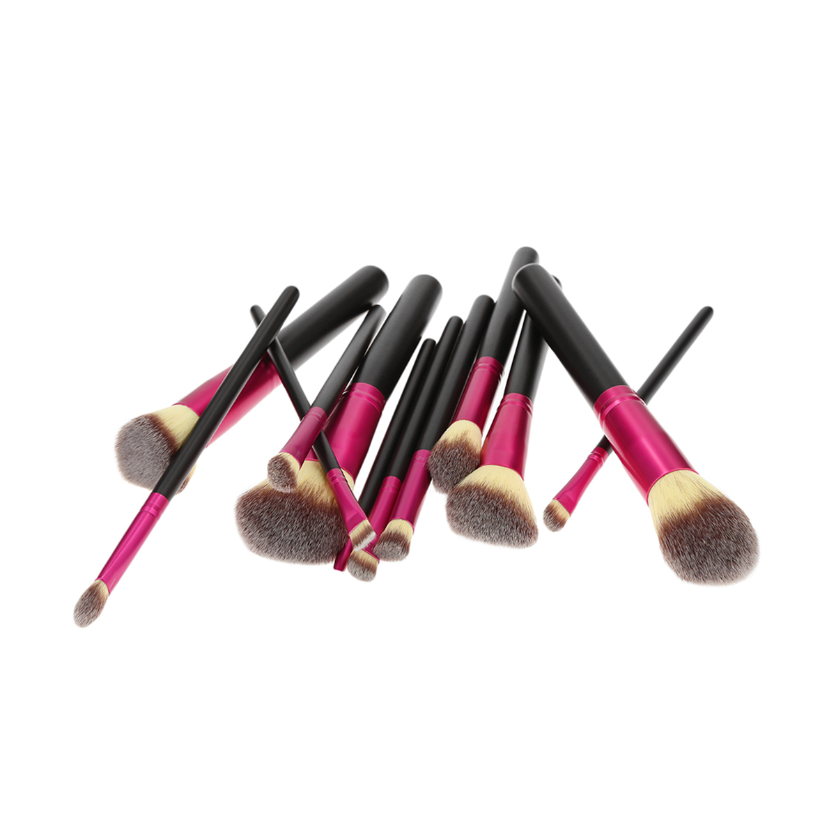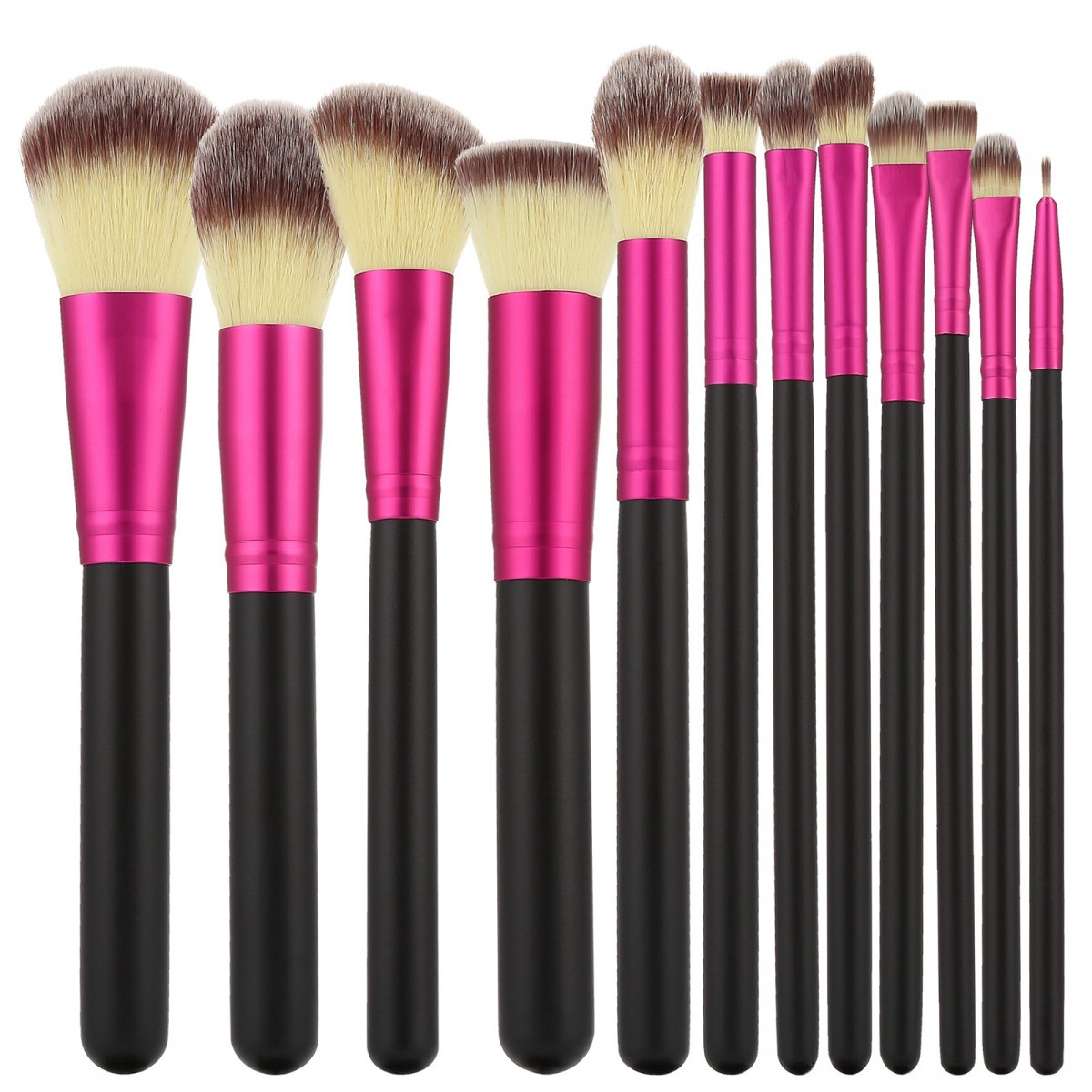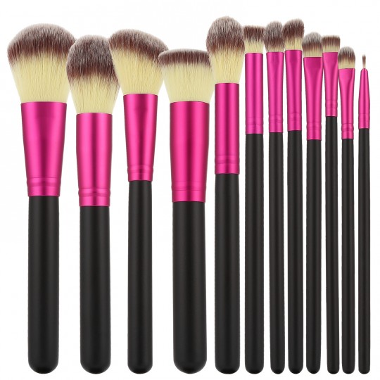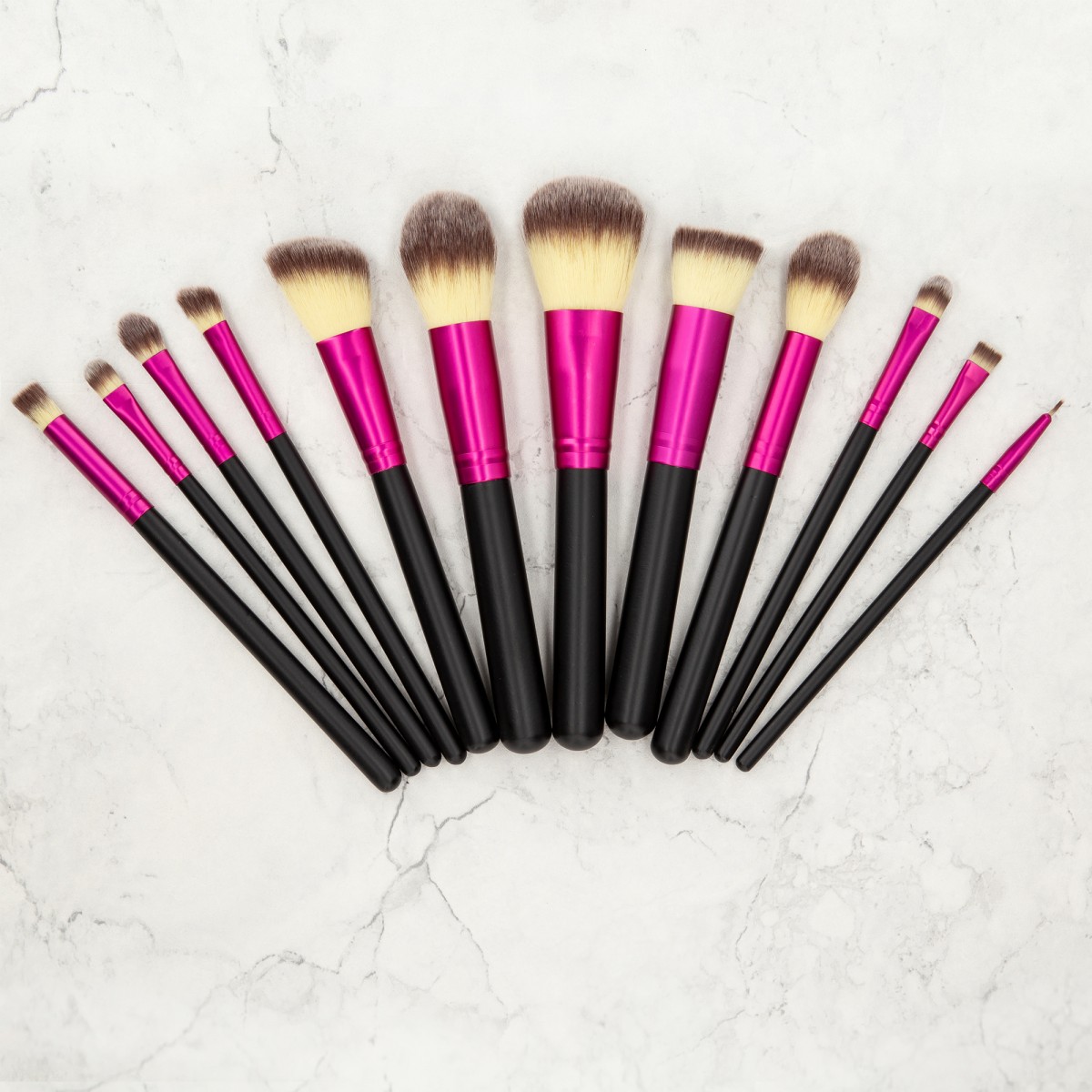Σετ 12 πινέλων μακιγιάζ για καθημερινή χρήση κατασκευασμένα από συνθετικές ίνες με μαύρη λαβή και φουξ λεπτομέρεια.